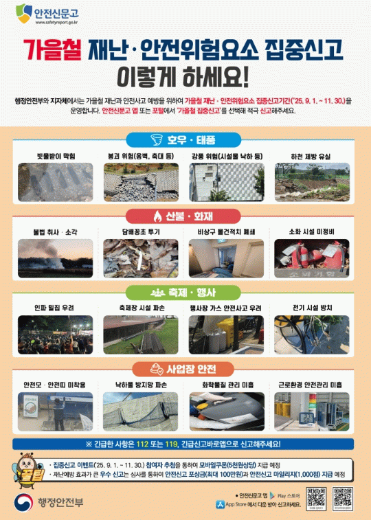 이번 집중신고 기간은 가을철에 발생 가능성이 높은 재난·안전사고를 예방하기 위한 것으로, 신고 대상은 축제·행사, 호우·태풍, 산불·화재, 사업장 안전 4개 유형이다.