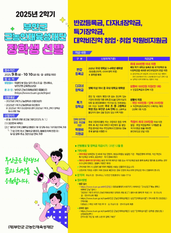 권익현 부안군 근농인재육성재단 이사장은 “이번 신청 기간에는 1학기 장학금 미신청자도 1~2학기 장학금을 동시 신청 가능하고 읍면사무소 방문이 어려울 시 온라인 시스템을 통해서도 간편하게 신청할 수 있다”며 “해당 학생 및 학부모가 모두 관심을 가지고 누락 없이 장학금을 신청할 수 있도록 홍보에 만전을 기하겠다”고 말했다.