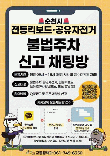 이번 오픈채팅방은 카카오톡에서 ‘순천시 전동킥보드’를 검색하거나 시에서 제공하는 홍보물의 QR코드를 통해 참여할 수 있다.