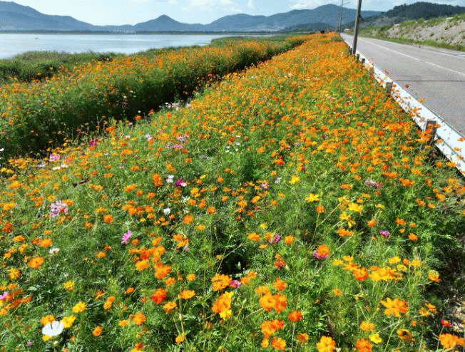 이번에 만개한 꽃은 일반 코스모스, 황화 코스모스, 백일홍과 같은 다채로운 가을꽃들로, 방조제 일원 약 42,000제곱미터(㎡)에 알록달록하게 펼쳐져 방문객들의 눈길을 사로잡고 있다.