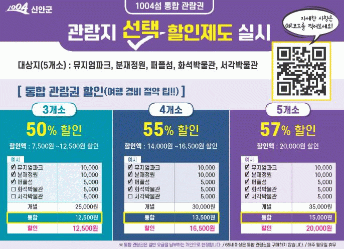 할인 적용 대상 시설은 신안군의 대표 관광지인 뮤지엄파크, 1004섬 분재정원, 퍼플섬, 화석박물관, 서각박물관 등 총 5개소이다.