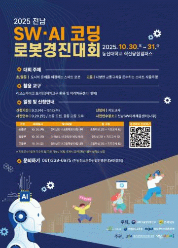 심상완 전남도 연구바이오산업과장은 “이번 대회가 청소년에게 소프트웨어와 인공지능 분야 창의력과 도전정신을 키우는 소중한 기회가 되길 바란다”며 “앞으로도 디지털 인재 양성을 위한 지원을 더욱 확대하겠다”고 말했다.