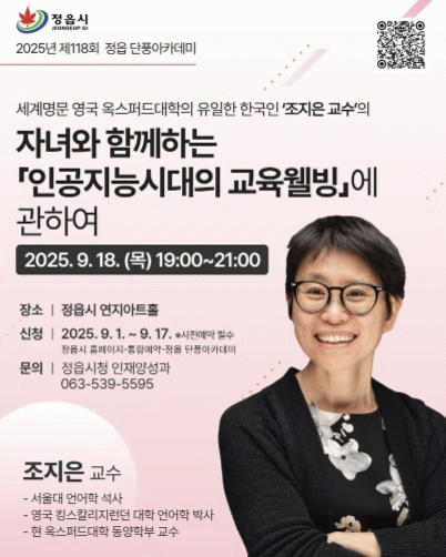 조 교수는 ‘자녀와 함께하는 인공지능 시대의 교육웰빙’을 주제로, 급변하는 AI 환경에서 자녀 교육과 학습을 어떻게 건강하게 조율할 수 있을지 다양한 연구와 사례를 통해 풀어낼 예정이다.
