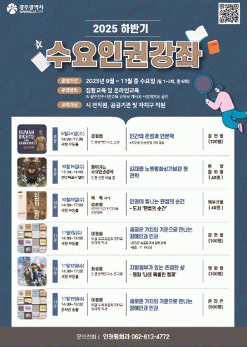 이후 교육일정은 ▲10월15일 찾아가는 수요인권강좌(공직자 인권 현장 방문) ▲10월29일 북토크 ‘헌법의 순간’(박혁 작가) ▲11월5일 새로운 가치와 기준으로 만나는 장애인과 인권(이명희 독일 도르트문트대 장애학 박사) ▲11월12일 영화 ‘나의 특별한 형제’로 풀어보는 지방정부가 있는 존엄한 삶(최성윤 인권정책연구소 연구원) 등이다.