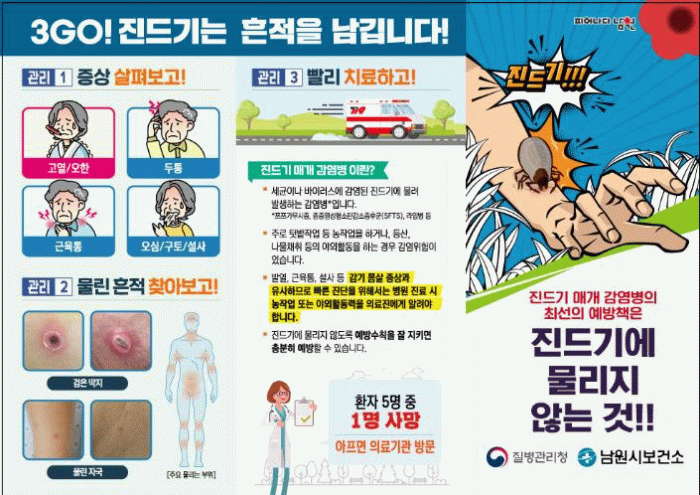또한, 중증열성혈소판감소증후군(SFTS)의 2차 감염 예방을 위해 관내 동물병원과 애견샵을 대상으로 2차 감염 예방 홍보를 실시하고, 읍면동 행정복지센터와 유관기관에 교육자료를 배포하여 전 시민 대상 진드기 예방 교육 및 홍보를 강화하며, 현수막과 누리집, 전광판 등 다양한 매체를 활용해 예방수칙 안내 등 진드기 매개 감염병 발생 예방에 적극 대비할 예정이다.