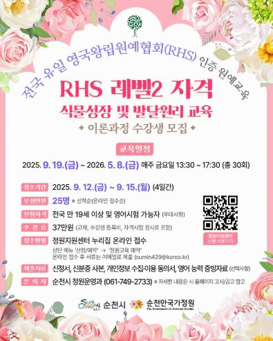 순천시 정원운영과 관계자는 “RHS 교육을 통해 수강생들이 세계적 수준의 정원 전문가로 성장하는 것은 물론, 정원 분야 일자리와의 연계에도 도움이 될 것으로 기대한다”며 “앞으로도 국가정원을 거점으로 한 순천형 정원산업의 발전을 이끌겠다”고 말했다.