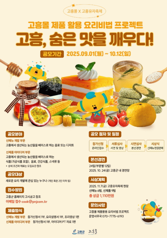 이번 공모전은 고흥에서 생산되는 농수산물을 활용한 창의적인 조리법(레시피)과 상품 아이디어를 발굴해, 지역 농산물의 부가가치를 높이고 농가 소득 증대 및 지역경제 활성화를 도모하기 위해 마련됐다.