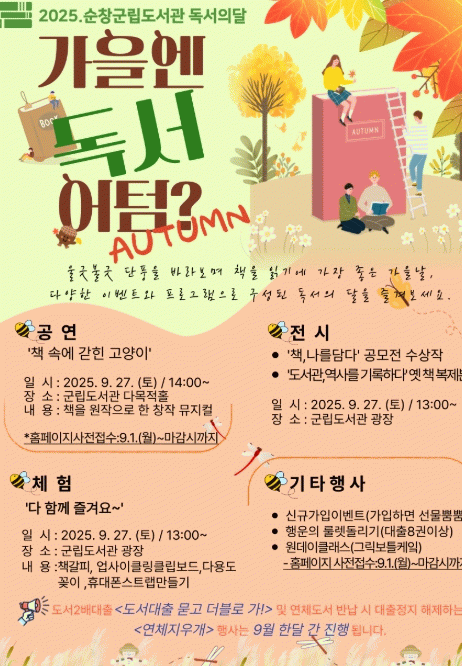 군 관계자는“책을 통해 가을의 정취를 느끼고, 도서관을 문화와 소통의 장으로 새롭게 경험할 수 있는 뜻깊은 기회가 될 것”이라며“군민 여러분의 많은 관심과 참여를 바란다”고 전했다.