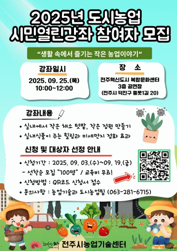 전주시농업기술센터 관계자는 “도시 인구가 증가하면서 환경문제, 식생활 불균형, 정신적 스트레스 등 다양한 사회문제가 대두되고 있으며, 이에 대한 대안으로 떠오르는 도시농업은 단순한 취미활동을 넘어 도시민들의 건강과 환경을 지키는 중요한 실천으로 주목받고 있다”면서 “이번 열린강좌를 통해 더 많은 시민이 도시농업에 관심을 갖고 함께 실천해 나가는 계기가 되길 바란다”고 말했다.