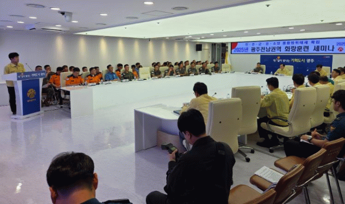 세미나 주요 내용은 ▲2025년 화랑훈련 통제 및 평가계획(2작전사) ▲2025 화랑훈련 준비계획(31사단·광주시·전남도) ▲광주공항 대테러작전 수행계획(광주경찰청) ▲다중이용시설 테러대응훈련 계획(전남경찰청) ▲긴급구조통제단 편성 및 임무역할(광주소방안전본부) ▲핵 대비 소방대응계획(전남소방본부) 등을 발표하고 토의했다.