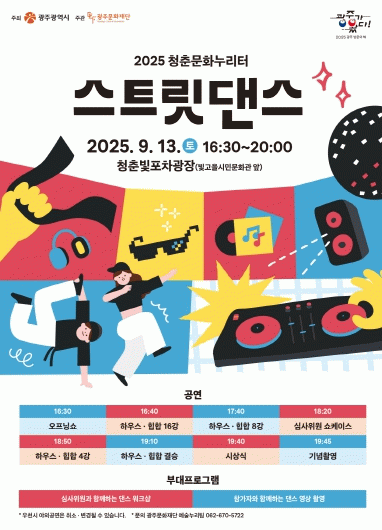 이번 행사는 청년이 주체가 되어 거리문화를 만들어가는 '2025 청춘문화누리터' 사업의 일환으로, 거리문화의 대표 장르인 스트릿댄스 1:1 배틀로 꾸며진다. 거리와 광장에서 시작된 스트릿댄스는 자유롭고 역동적인 무대를 특징으로 하며, 청년들의 에너지와 창의성을 시민과 공유하기에 가장 적합한 장르다.