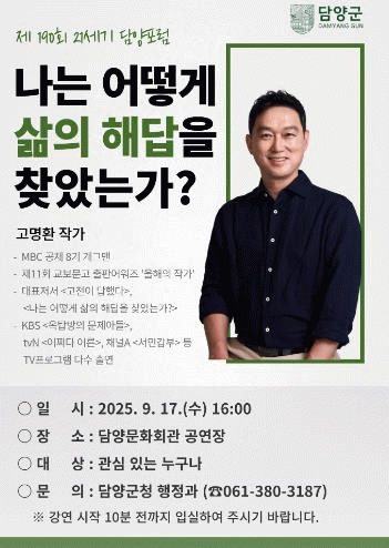 담양군 관계자는 “삶의 방향에 대해 함께 고민해 볼 수 있는 자리를 마련했다”며 “이번 강연이 군민들에게 따뜻한 울림을 전하길 기대한다”고 말했다.