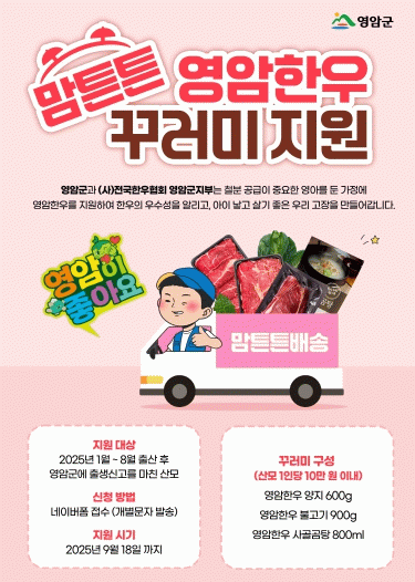 이승준 영암군 농축산유통과장은 “아이 키우기 좋은 도시 영암과 영암한우의 우수성을 동시에 알릴 수 있는 사업에 산모들의 많은 신청바란다. 맘튼튼 영암한우 꾸러미 사업이 매년 이어질 수 있도록 제도로 정착해 나가는 방안도 강구하겠다”고 전했다.