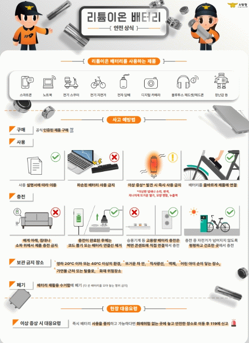 이에 소방서는 ▲정품 충전기 사용과 과충전 방지 ▲배터리를 안전한 곳에 보관 및 징후를 사전에 점검 ▲화재 발생 시 대피를 우선 ▲배터리 폐기 시 전용 수거함을 이용 등의 안전수칙 준수를 당부했다.