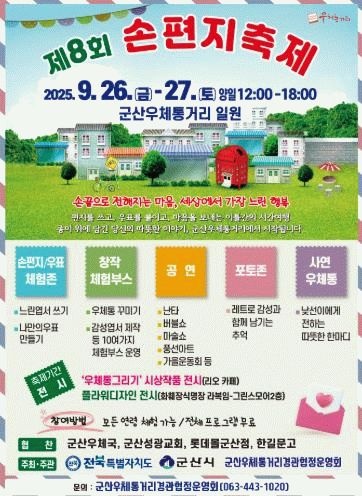 가을의 정취가 물씬 풍기는 우체통거리에서 펼쳐지는 이번 손편지 축제는 빠르게 변화하는 시대 속에서 ‘느림의 미학’과 ‘감사의 마음’을 되새기는 뜻깊은 시간이 될 것으로 기대되는 만큼 많은 시민과 관광객의 관심과 참여가 이어질 것으로 예상된다.