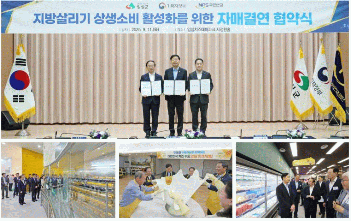 군은 지난 11일 임실치즈테마파크 지정환홀에서 기획재정부 구윤철 경제부총리 겸 장관과 심 민 군수, 국민연금공단 김태현 이사장이 참석한 가운데 지방살리기 상생소비 활성화를 위한 자매결연 협약식을 체결했다.