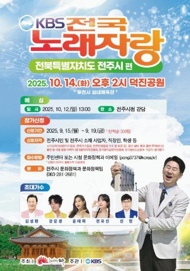 전주시는 오는 10월 14일 오후 2시, 덕진공원에서 온 국민의 사랑을 받아온 KBS ‘전국노래자랑’ 전북특별자치도 전주시편이 개최된다고 12일 밝혔다.