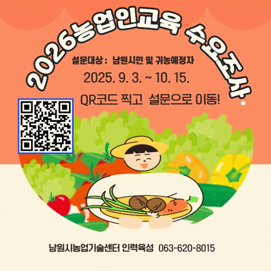 이번 설문조사는 지역 농업인 및 귀농 귀촌인의 관심분야, 영농 애로사항, 희망 교육 주제 및 품목 등을 파악하여 현장 중심의 맞춤형 교육과정을 편성하는 데 활용될 예정이다.