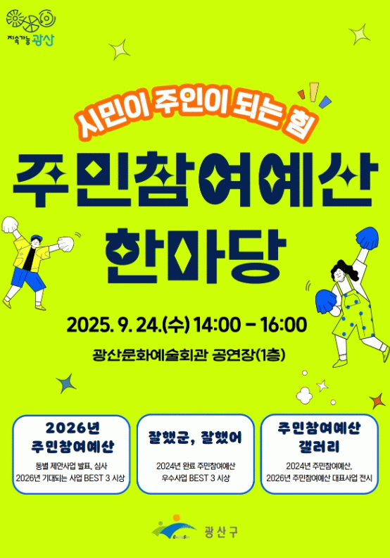 박병규 광산구청장은 “올해 주민참여예산 한마당은 주민이 생활 현장에서 직접 찾아낸 아이디어로 발굴한 제안 사업을 공유하는, 지역 민주주의 실현의 장이 될 것”이라며 “시민의 목소리와 의견을 예산으로 반영하는 주민참여예산이 시민이 주인이 되는 자치 행정의 마중물이 되도록 내실을 강화하겠다”고 밝혔다.