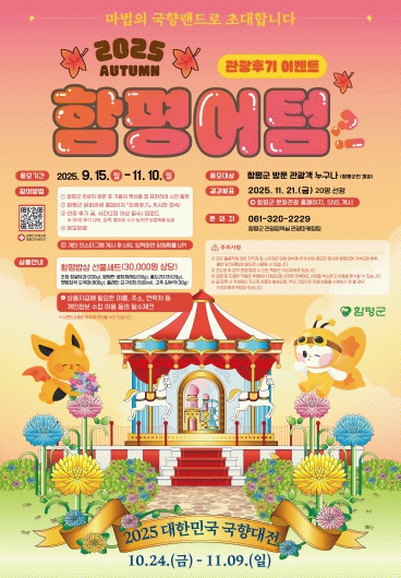 특히, 이번 행사는 10월 24일부터 11월 9일까지 ‘마법의 국향랜드’라는 주제로 열리는 ‘2025 대한민국 국향대전’와 연계해 관광객 참여를 더 활성화하고 가을철 함평의 매력을 전국에 알릴 것으로 기대된다.