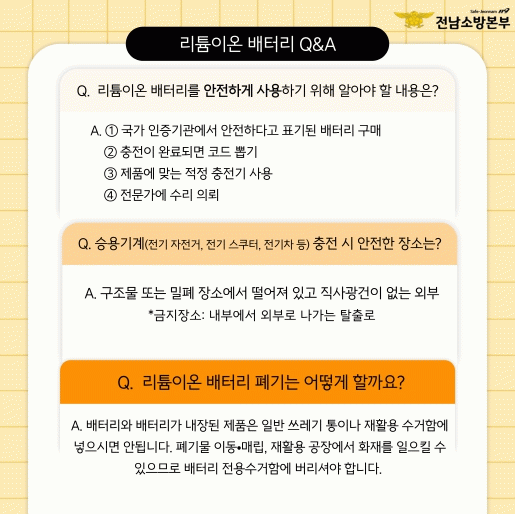 정용인 강진소방서장은 “리튬이온 배터리는 편리함과 함께 화재 위험도 내포하고 있다”며 “작은 습관의 변화와 주의 깊은 관리가 대형 화재를 막는 가장 효과적인 방법”이라고 말했다. 또한 “강진소방서는 공동주택, 학교, 다중이용시설 등을 중심으로 찾아가는 안전교육과 캠페인을 꾸준히 확대하여 군민 모두가 스스로 안전을 지키는 문화가 정착되도록 힘쓸 것”이라고 덧붙였다.