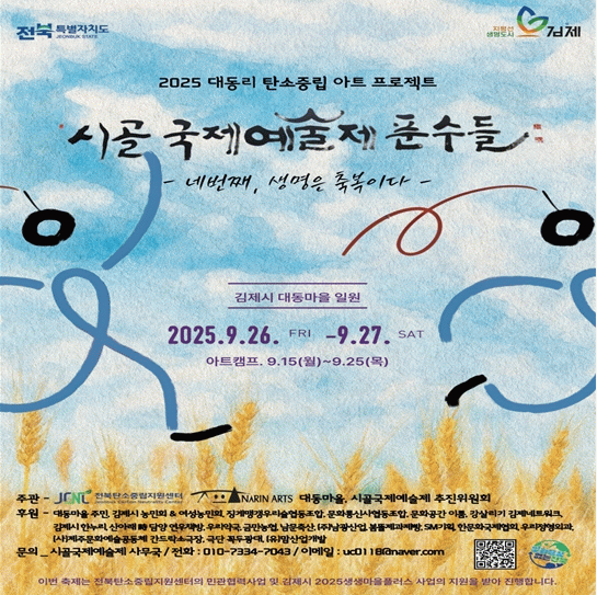 아트캠프에서는 ▲탄소중립 오브제 제작 ▲새만금 생태길 플로깅 ▲지역 설화를 바탕으로 한 마당극 ▲대동깃발 설치 등 다양한 프로그램이 진행되며, 마을 전체가 예술 공간으로 탈바꿈한다. 본행사에는 미국, 일본, 중국, 라오스 등 5개국 20여개 팀이 참여해 공연을 펼치고, 농촌 탄소중립 세미나, 설치미술 및 체험 전시 등 풍성한 볼거리를 제공한다.