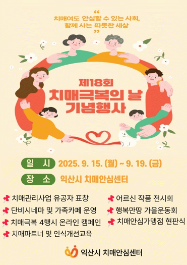 또한, 행사기간 익산시치매안심센터에서는 어르신 작품 전시회, 단비시네마, 가족카페, 기념촬영 공간 등이 상시 운영된다.