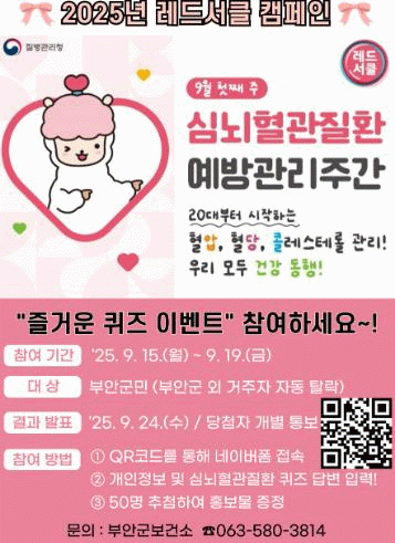 심뇌혈관질환과 관련된 퀴즈를 풀고 정답을 맞힌 참여자 중 50명을 추첨해 홍보물을 증정하며, 당첨 결과는 9월 24일 발표될 예정이다.