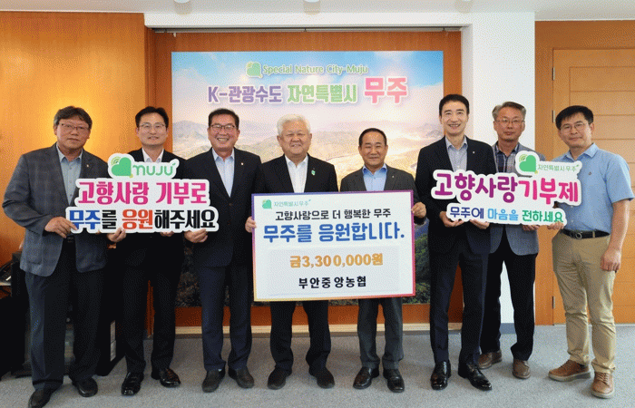 신정식 부안중앙농협 조합장은 “무주지역의 발전과 군민 행복을 응원하는 마음으로 조합원들이 십시일반 기금을 모았다”라며 “부안중앙농협은 무주군 고향사랑기부제 활성화와 지역발전을 위해 앞으로도 무주구천동농협과 지속적으로 협력해 나갈 것”이라고 밝혔다.