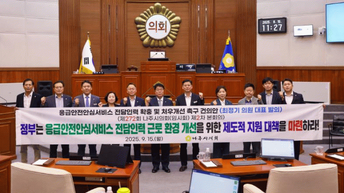 나주시의회는 이번 건의안을 통해 ▲관리 가구수 상한제 도입 및 전담 인력 즉시 확충 ▲표준 급여 및 수당 가이드라인 마련으로 지역 간 처우 격차 해소 ▲국비 지원 확대로 지자체 부담 완화 및 고용 안정 보장 ▲ICT 시스템 고도화 및 노후 장비 즉시 교체할 것을 촉구했다.