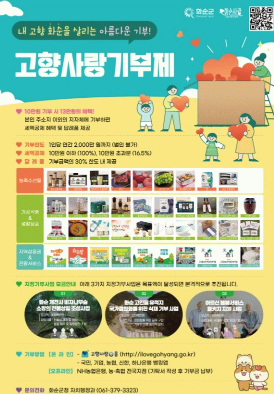 화순군은 앞으로도 고향사랑기금이 지역사회 발전과 주민 복리 향상에 기여할 수 있는 다양한 사업을 지속적으로 발굴하고, 이를 통해 기부자의 소중한 마음이 군민의 삶의 질 향상과 지역발전으로 이어질 수 있도록 적극 노력해 나갈 계획이다.