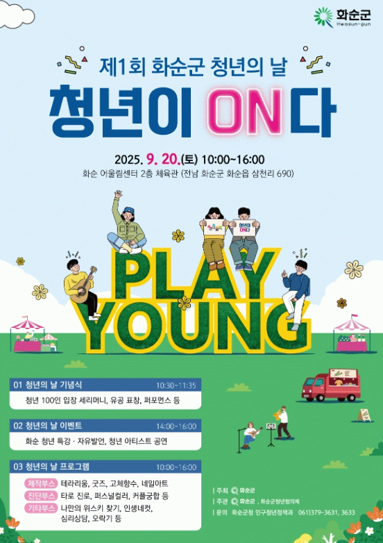 조미화 인구청년정책과장은 “이번 청년의 날은 청년이 주인공이 되어 직접 참여하고 즐길 수 있는 행사로 준비했다”라며, “청년들의 역량과 가능성이 지역사회 곳곳에서 발휘될 수 있도록 화순군은 행정적 지원을 아끼지 않겠다”라고 밝혔다.