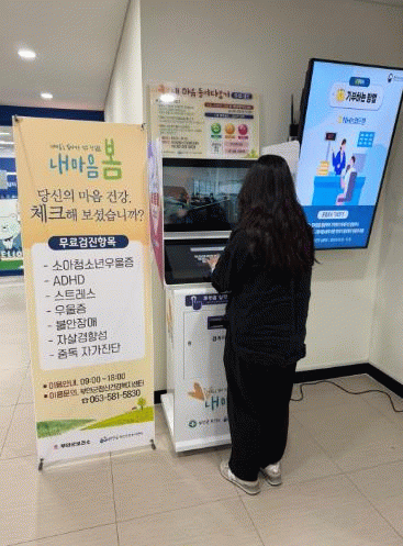 무인정신건강검진기는 우울, 불안, 스트레스 등 정신건강 상태를 간단한 설문을 통해 자가 점검할 수 있는 장비로 검진 결과에 따라 전문 상담 서비스를 받을 수 있다.