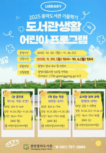 이용민 중마도서관팀장은 “이번 프로그램은 단순한 학습을 넘어 계절의 특성과 과학적 원리를 실험과 체험을 통해 직접 경험할 수 있도록 기획했다”며 “어린이 프로그램 전문 강사의 지도로 책과 관련된 다양한 활동을 하며 학습과 놀이를 동시에 즐길 수 있을 것”이라고 말했다.