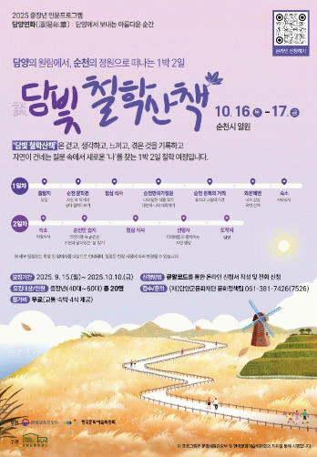 이번 프로그램은 순천의 정원과 생태 공간을 걸으며 명상과 글쓰기를 통해 내면의 목소리에 귀 기울이고 삶을 되돌아보는 여정으로, 10월 16일 담양에서 출발해 순천 일대를 여행한다.