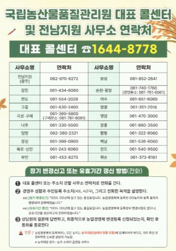 등록정보의 변경신고는 농관원 사무소에 전화·방문하거나 콜센터, 온라인서비스(농업e지)를 통해 가능하다.