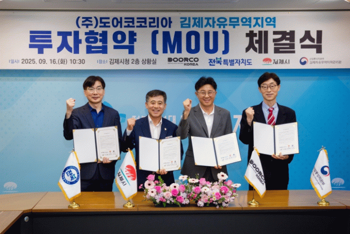 16일 시에 따르면 시청 2층 상황실에서 ㈜도어코코리아와 368억 원 규모의 투자협약(MOU)을 체결했으며 이번 협약으로 김제자유무역지역에 1만 평(33,000㎡) 규모의 제2공장을 신설해 350여 명의 신규 고용이 창출될 예정이다.