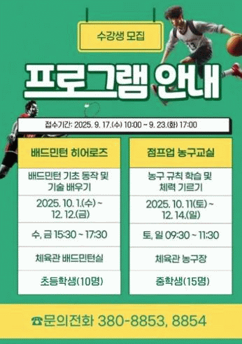 참여 희망자는 오는 17일 오전 10시부터 23일 오후 5시까지 회관 누리집을 통해 신청하면, 선착순으로 농구 15명, 배트민턴 10명 등 25명을 선정한다.