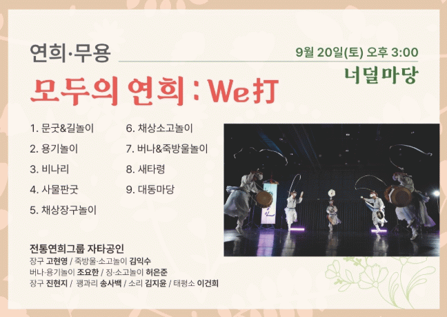 전통연희는 공동체가 함께 어울리며 소통하는 대표적 공연예술로, 타악의 울림 속에 하나 되고, 놀이와 재담을 통해 희로애락을 나누어 온 우리 민족의 흥과 신명이 집약된 무대다. 이번 공연은 전통연희를 현대적 감각으로 재해석해, 관객과 예술인이 함께 호흡하는 소통형 공연으로 진행된다.