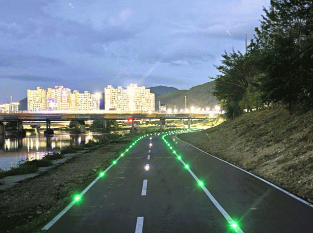 ‘활주로형 LED 표지병’은 비행기 활주로에 설치된 유도등에서 착안한 바닥 조명이다. 일정 간격을 두고 부착되어 야간 운행 시 시야 확보에 용이하다. 특히 곡선 구간, 교차로, 보행자 접점 구간에서 사고를 예방하는 데 효과적이다.