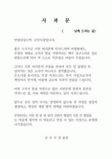 강임준 시장은 “좋은 소식으로 시민 여러분께 인사드려야 마땅함에도 불구하고, 주정차 과태료 고지서 발송 지연이라는 문제로 말씀드리게 되어 매우 부끄럽고 마음이 무겁다”며 “시민 여러분의 꾸중을 외면한 채 넘어가는 것은 도리가 아니라고 생각했기에, 쓴소리를 듣더라도 시장으로서 마땅히 져야 할 책임이라 생각하며, 이번 일에 대해 깊이 사과드린다”고 전했다.