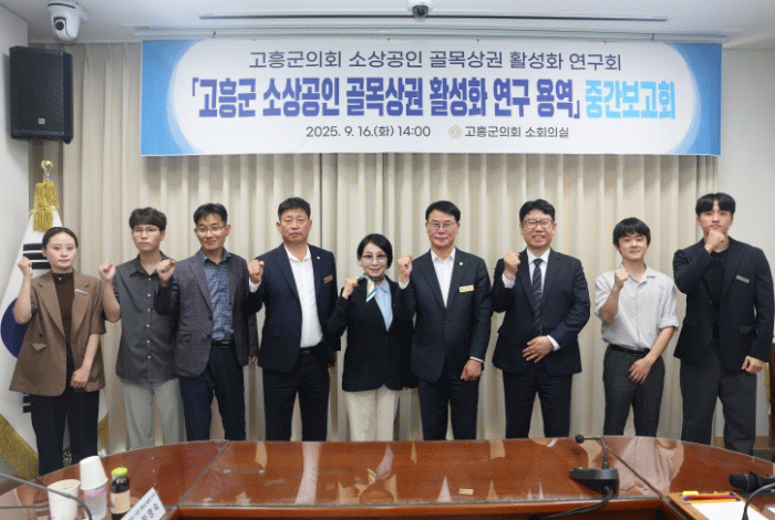 이번 중간보고회에는 ‘고흥군의회 소상공인 골목상권 활성화 연구회(대표 이재학, 간사 전명숙, 조영길・한승욱・김민열 의원)’의 주관으로 열렸으며, 류제동 의장, 연구회 간사 전명숙 의원을 비롯한 연구회 소속 의원, 연구용역 수행을 맡은 주식회사 착한동네 관계자, 관계 공무원 등이 참석했다.