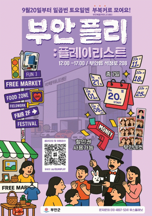 이어 “부안군은 ‘부안 플리’ 행사를 계절별 테마 마켓, 청년기획 플리마켓 및 버스킹 공연 등으로 확대·정례화해 정기적으로 운영할 계획”이라고 덧붙였다