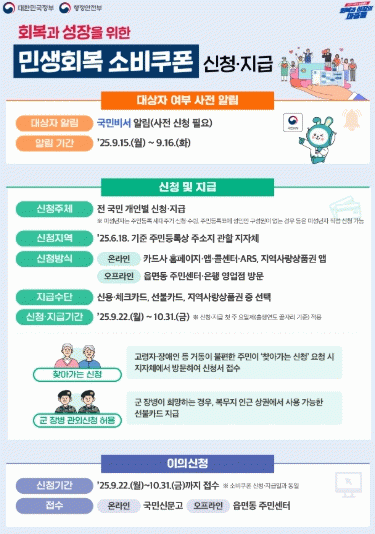 신청 방법은 온·오프라인 창구를 통해 지역사랑상품권(카드·모바일)과 신용·체크카드, 선불카드 중 선택할 수 있으며, 신청 초기 몰림에 따른 민원 혼잡을 줄이기 위해 온라인 및 오프라인 소비쿠폰 신청 시 첫째 주(9월 22일~26일)까지는 출생 연도 끝자리 기준 요일별 5부제가 적용된다. 주말에는 온라인 신청만 가능하다.