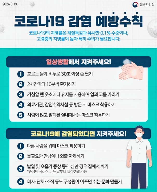 아울러, 코로나19 확산세가 지속됨에 따라 고위험군이 많이 이용하는 의료기관‧요양시설의 종사자와 방문객은 마스크 착용 등 코로나19 예방수칙을 더욱 철저히 준수하여야 한다.