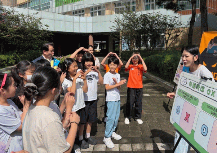 현장에서는 ‘OX 퀴즈를 통한 아동학대 예방 교육’이 진행됐다. 학생들은 문제를 듣고 손동작으로 OX를 표시하며 참여해 아동학대 예방 메시지를 쉽고 직관적으로 이해하는 시간을 가졌다.