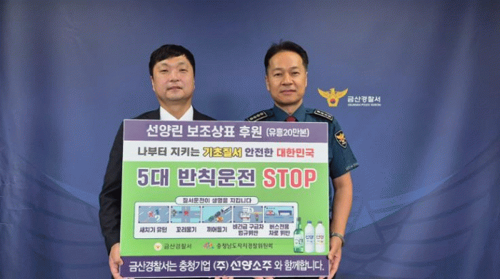 금산경찰서장은 “불공정한 방식으로 교통 소통과 안전에 지장을 주는 기본적인 교통질서 위반행위를 근절해야 교통사고 위험으로부터 생명을 지킬 수 있다.”며 “향토기업인 ㈜선양소주가 교통질서 확립을 위해 협력해 주셔서 매우 감사하고 앞으로도 민·관이 함께하는 협업을 통해 교통사고 예방과 질서 확립을 확대해 나가겠다.”라고 말했다.