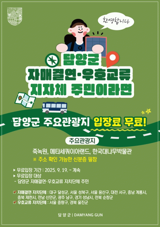 정철원 군수는 “이번 정책은 지역 간 우호 증진은 물론, 담양 관광 활성화와 지역 상권과의 상생에도 크게 기여할 것으로 기대된다”라며 “앞으로도 다양한 교류 정책을 통해 생활인구 유입을 늘리고, 담양의 문화·관광 자원을 알리는 데 행정력을 집중하겠다”라고 말했다.