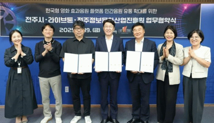 전주시와 (재)전주정보문화산업진흥원, 국내 최대 영화음향 전문기업인 라이브톤(대표 최태영)은 19일 시청 3층 회의실에서 우범기 전주시장과 허전 진흥원장, 최태영 대표 등이 참석한 가운데 ‘한국형 영화 효과음원 플랫폼(케이사운드 라이브러리) 서비스 확산을 위한 업무협약’을 체결했다.
