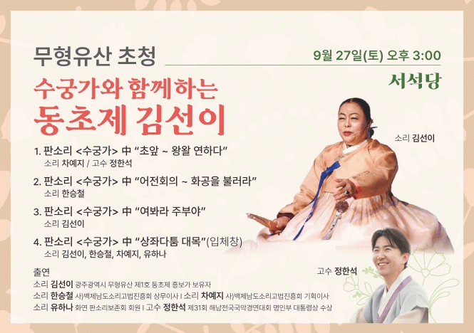 이번 공연에서는 김선이 보유자가 고수 정한석과 함께 '수궁가'의 대표 대목을 선보이고, 이어 백제남도소리고법진흥회의 한승철·차예지 명창이 주요 대목을 나누어 불러 다채로운 무대를 꾸민다. 마지막에는 출연진이 모두 함께하는 입체창 무대가 이어져 관객들에게 판소리의 진수를 들려줄 예정이다.